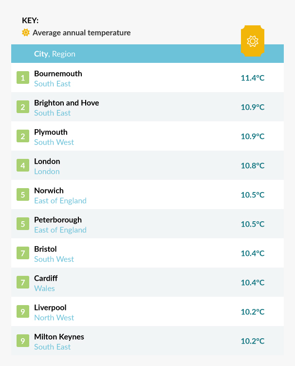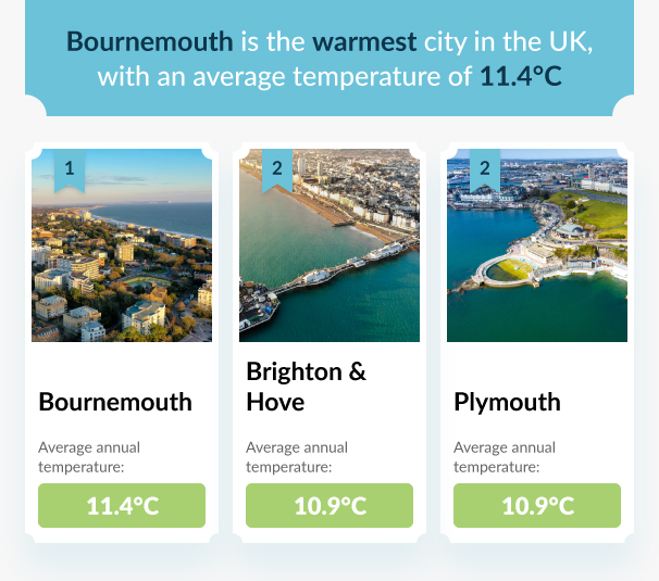 The city with the warmest climate is Bournemouth, with an average annual temperature of 11.4°C. Although itâs only 0.3°C warmer than second place, every °C counts when you live in the UK. Bournemouth is known for its beaches, which are the perfect companion to its warmer temperatures.