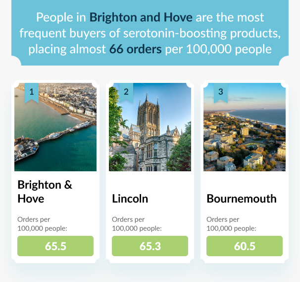 Completing our top three is Bournemouth, with 60.5 orders for serotonin-boosting products per 100,000 people in 2022. Bournemouthâs total number of orders for serotonin-boosting products was 99, which was one of the highest in the UK. Like Brighton, Bournemouth is also known for its seaside, seven miles of it in fact, which has been awarded the Blue Flag status.