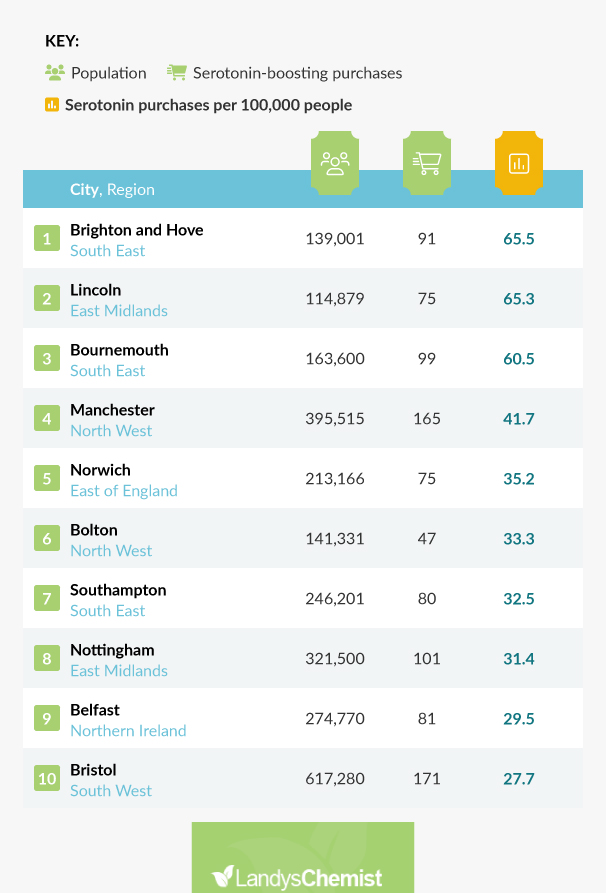 Brighton and Hove takes the top spot with just over 65 orders for serotonin-boosting products per 100,000 people in 2022. Brighton is one of the most vibrant cities in the UK, with an exciting music and arts scene. As well as its stunning seaside, itâs famous for its quirky shopping areas and large LGBTQ+ population.