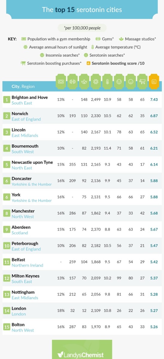 So, we wanted to find out which cities have the most serotonin-boosting potential; looking at the number of gyms, massage parlours, types of climate, hours of daylight, and much more to reveal the serotonin-boosting capital of the UK.