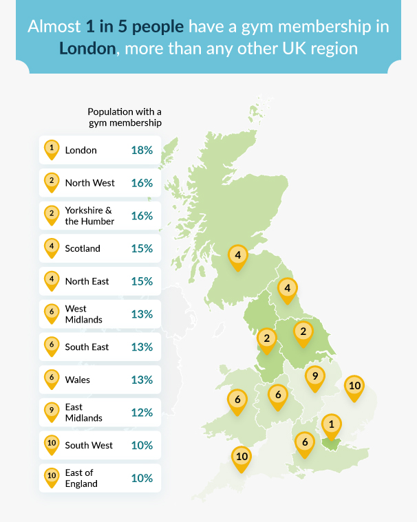 Taking the top spot is London with 18% of the population having a gym membership. Almost one in every five people in Englandâs capital has a gym membership, which equates to more than 1.5 million people. However, London has just 32 gyms per 100,000 people, which could result in an incredibly crowded workout space for those regular gymgoers.